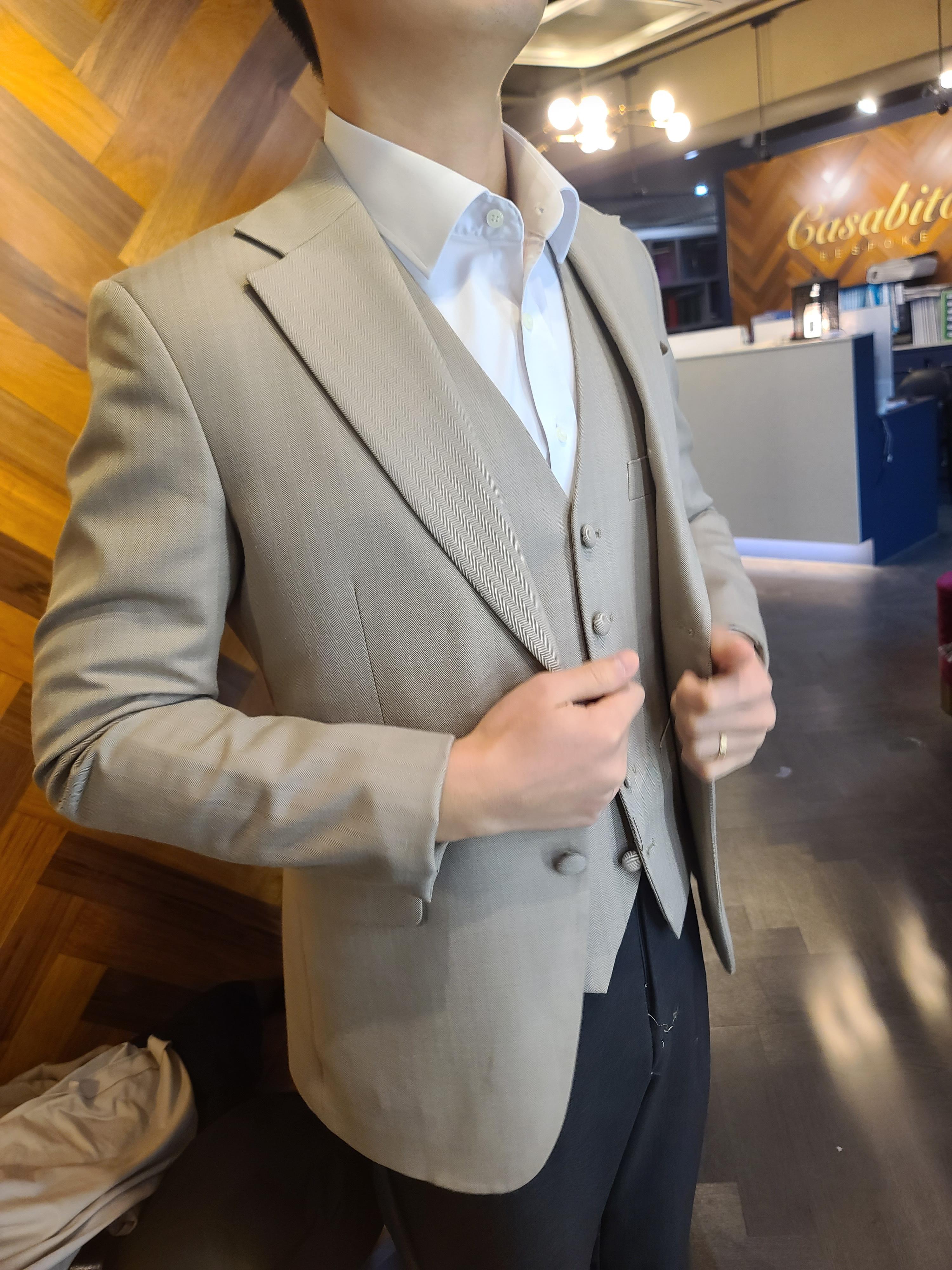 테일러분께서 여기저기를 보시면서 뭐 바지 허벅지는 줄여주겠다, 팔 기장은 조금 덜 줄이겠다 등등 수선을 어떻게 할 지 설명해주셨습니다. 가장 신기했던건, 제 어깨를 보시곤 오른손잡이라 오른쪽 어깨가 더 내려갔으니 오른쪽 어깨에 패드를 대 주신다고 했습니다. 실제로 어깨가 많이 내려가 있더군요. 패드를 한장 쏙 넣으니 감쪽같이 보정됐습니다.